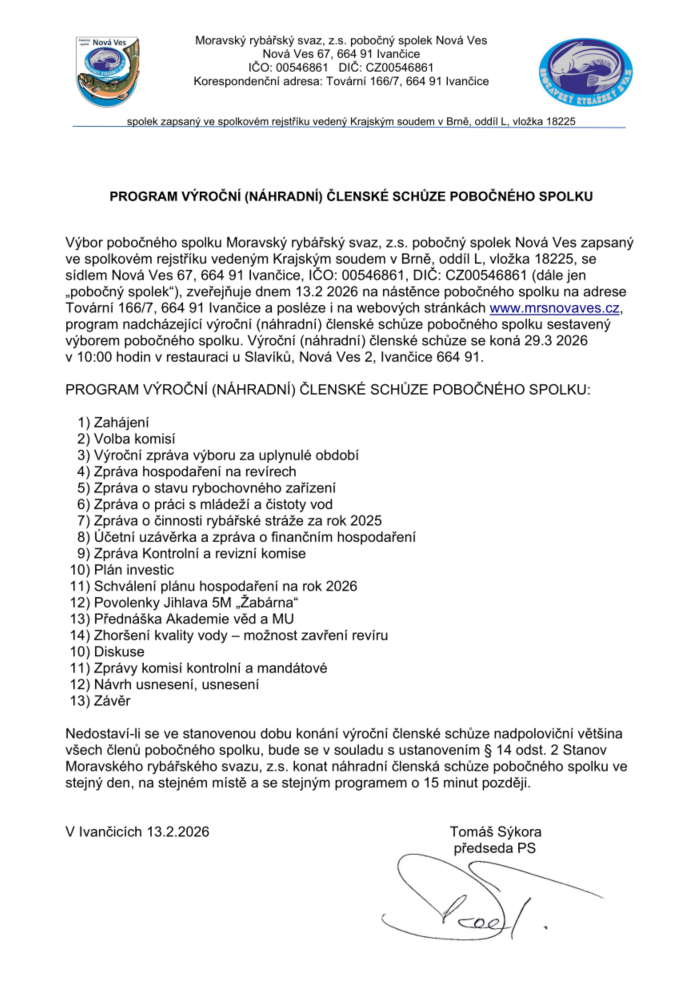 Uveřejňujeme Program výroční (náhradní) členské schůze pobočného spolku společně s pozvánkou.