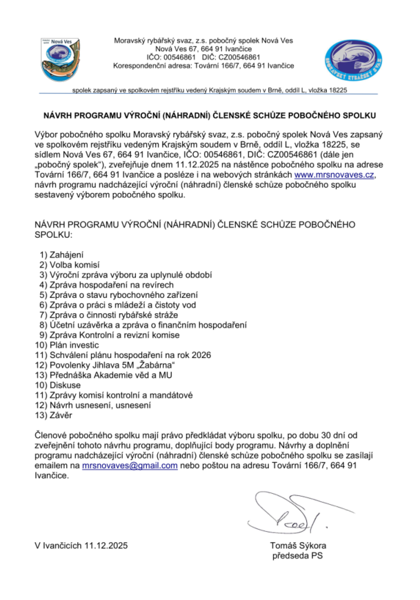 Blíží se konec roku a tím i členská schůze (termín bude upřesněn) proto zveřejňujeme i na webu návrh programu členské schůze pobočného spolku. Pokud máte návrhy k doplnění bodů, prosím posílejte je na adresu rybochovu (Tovární 166/7, 66491 Ivančice) nebo na email mrsnovaves@gmail.com .
